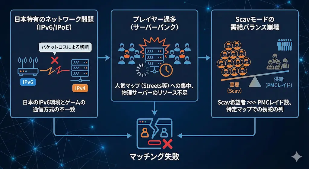 タルコフのサーバーはIPv4ベースで設計されているため、日本のISPが行う「IPv4 over IPv6」のカプセル化処理でパケットロスが頻発します。この微細な通信エラーに対し、ゲーム側が過剰に反応して「サーバー接続ロスト」を判定してしまうケースが大半です。