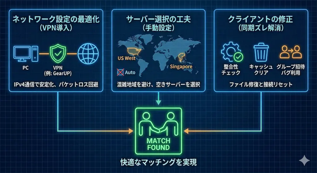私はGearUPの導入と海外サーバーの活用をおすすめします。特にUS Westサーバーは、多少のPing上昇を許容すれば驚くほど快適にプレイできます。